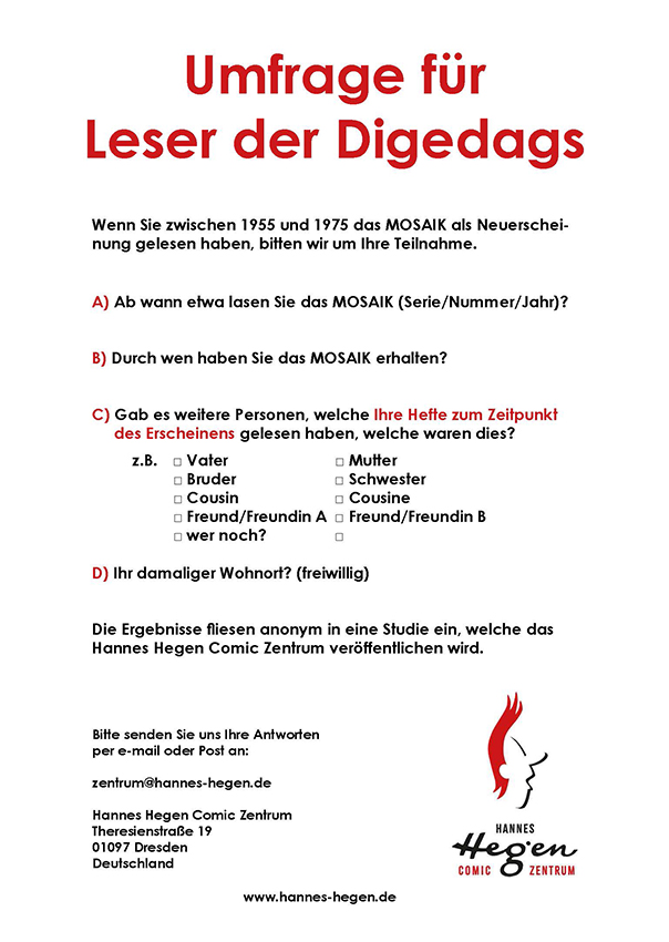 Der Mosaik-Fanclub, Berliner MOSAIK-Connection, sucht die beliebteste Mosaik-Titelseite aus den 223 erschienenen Mosaik-Heften von Hannes Hegen. Auf der Webseite des Journalisten Michael-Peter Jachmann, können Interessierte ihre zehn Lieblingscover abgeben: https://bärbel-wachholz.de/index.php/mosaik. Das Ergebniss wird im Fanzine Mosa-icke veröffentlicht, welches im Frühjahr